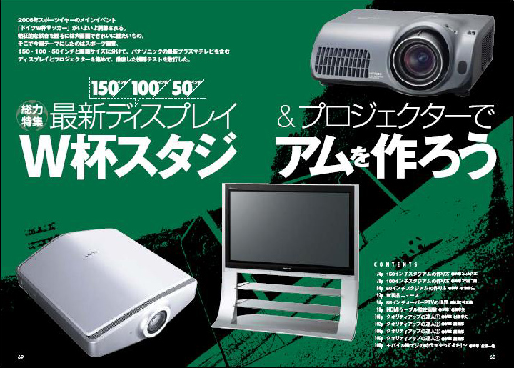 今年最大のイベントは何といってもドイツワールドカップでしょう。スポーツイベントは大画面で見ると臨場感、奥行感が違います。さて、その「大画面」ですが、あなたはスクリーン派ですか? それともテレビ派ですか? どうせなら両方やってしまいましょう! 「Wスクリーン」提案です。スクリーンとテレビでは、大画面の垣根がなくなりつつありますが、両者にはそれぞれの良さがあります。セッティングをきちんと行えば、両立させることは可能です。ここでは対象機器の厳密なテストは当然のこと、HDMIケーブル、アクセサリー、ラックなど周辺アイテムの情報も盛り込んでいます。 <好評連載> SPECIAL NEW PRODUCTS