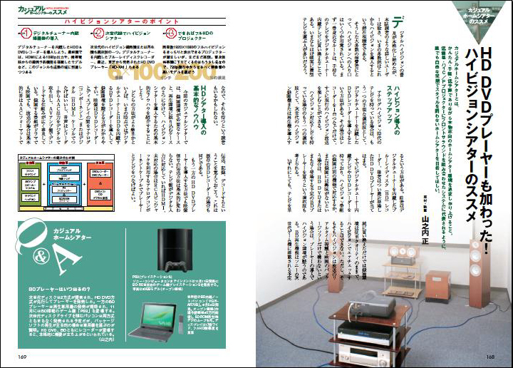 カジュアルホームシアターとは、かんたん・手軽・低予算でありながら実現できる本物志向のホームシアター環境を指す言葉です。今月のテーマは「HD DVDプレーヤーも加わった! ハイビジョンシアターのススメ」です。ひと昔ならハイビジョン機器は高嶺の花でしたが、いまは現実に購入できるような価格帯まで下がってきました。例えばハイビジョンシアターを導入するには、デジタルチューナー内蔵DVDレコーダーの購入がお薦めです。また、HD DVDプレーヤーもそれほど高いものではないので考えてみるのもいいでしょう。さらに、プロジェクターはハイビジョン映像を高画質で映し出す機器として、コストパフォーマンスが高く、ラインナップも豊富な製品カテゴリーです。あなただけのハイビジョンシアターを完成させてください。 好評連載中 「至高への誘い〜映像と音の華を求めて」 デジタルAV専門誌 月刊AV REVIEW 7月号 定価980円 平成18年6月17日発売 *バックナンバーの紹介* |