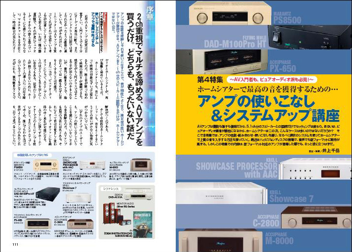 満を持して登場した「次世代光ディスク」。ハイビジョンならではの高い精細感と再現力は、大画面でこそ、魅力が発揮されます。ここではその魅力を引き出す条件として、120インチのスクリーン視聴を提案しました。フルHDプロジェクター、マランツのVP-11S1、ソニーのVPL-VW100、ビクターのDLA-HD11Kをレファレンスに、薄型テレビでは味わえない世界観を紹介していきます。 <第4特集> ホームシアターで最高の音を獲得するための・・・