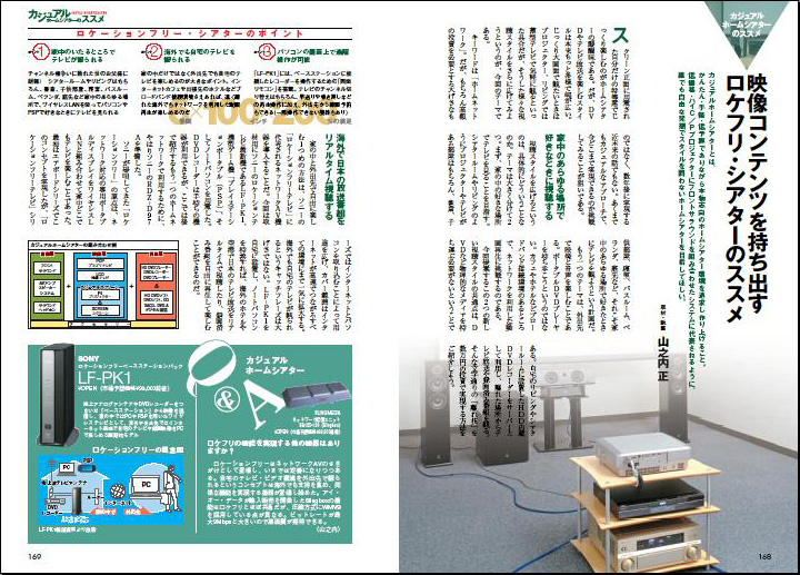 カジュアルホームシアターとは、かんたん・手軽・低予算でありながら実現できる本物志向のホームシアター環境を指す言葉です。今月のテーマは「映像コンテンツを持ち出すロケフリ・シアターのススメ」です。ホームシアターと言えば、家で楽しむものですが、コンテンツによっては外で楽しんでもいいわけで、それを実現する機器がなく、さらに環境が整っていなかったのが現状です。そのような中、巷ではこれらを実現するソニーのロケーションフリーがヒットしています。パソコンとインターネット環境を利用した快適AVライフ。さあ、思い立ったら実行です! 好評連載中 「至高への誘い〜映像と音の華を求めて」 デジタルAV専門誌 月刊AV REVIEW 8月号 定価980円 平成18年7月15日発売 *バックナンバーの紹介* |