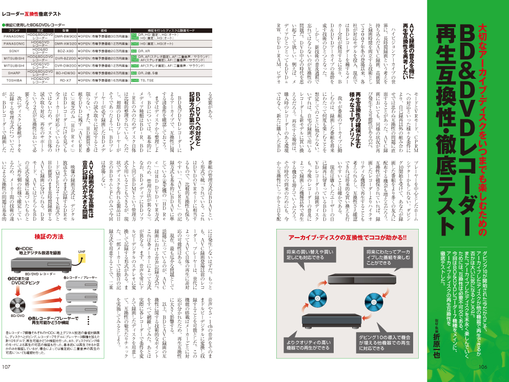 ダビング10が開始された今こそ、アーカイブしたディスクが他の機器で再生できるのか否かは、非常に気になるところですよね。今回は、BD及びDVDレコーダー7機種を用意し、条件を変えて、BD、DVDメディアにアーカイブ。7機種×7機種の総当りチェックを敢行しています。今こそ、互換性にしっかりと目を配らせる必要がありますよ。互換性一覧表は必見です。