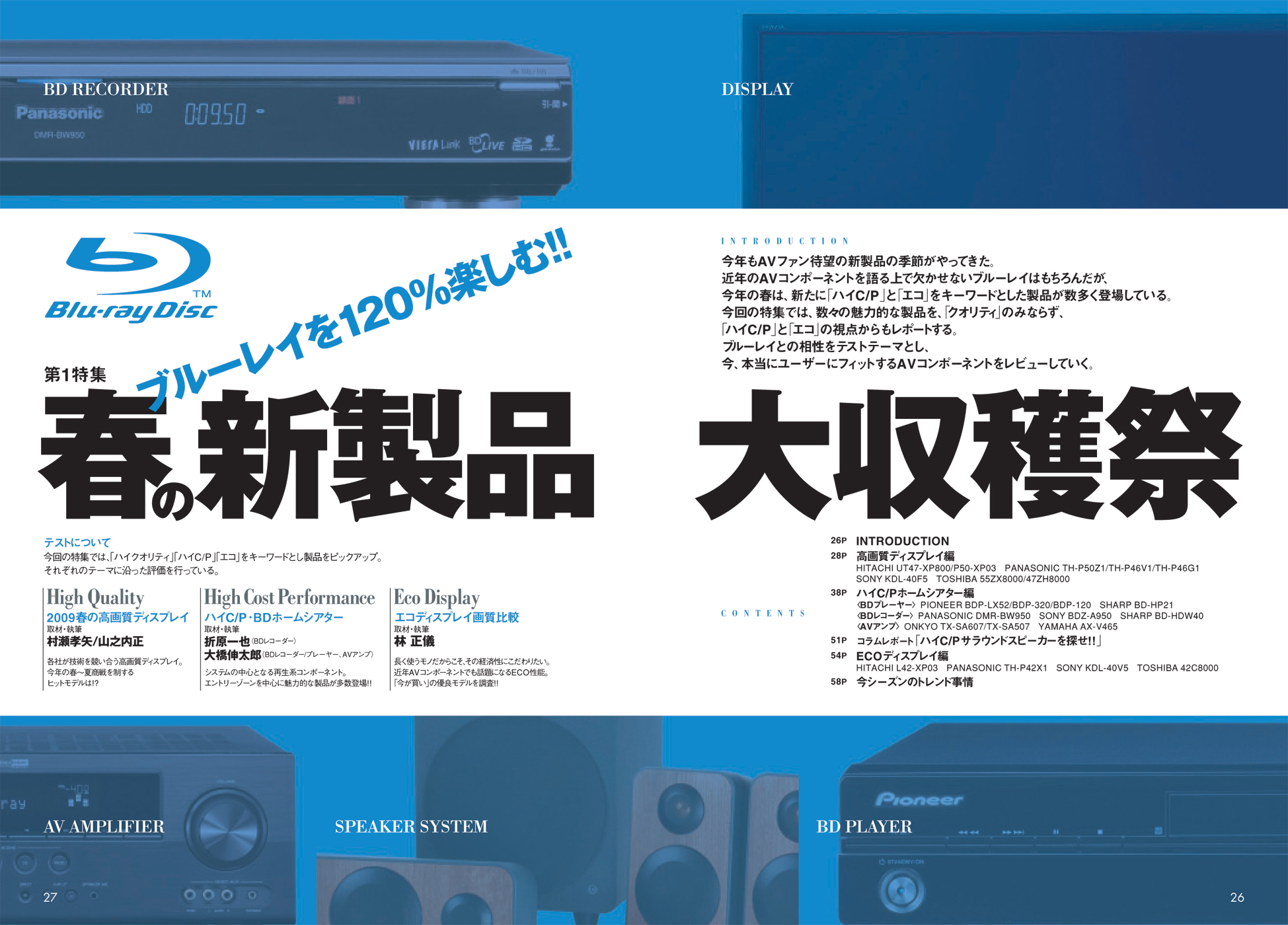 今年もAVファン待望の新製品の季節がやってきました。近年のAVを語る上で欠かせないブルーレイはもちろん、今春は「ハイC/P」と「エコ」がキーワードの製品が続々と登場しています。第1特集では「ブルーレイを120%楽しむ」をテーマに、クオリティのみならず、C/Pやエコの要素も重視しながら、魅力的な新製品をレポートしていきます。