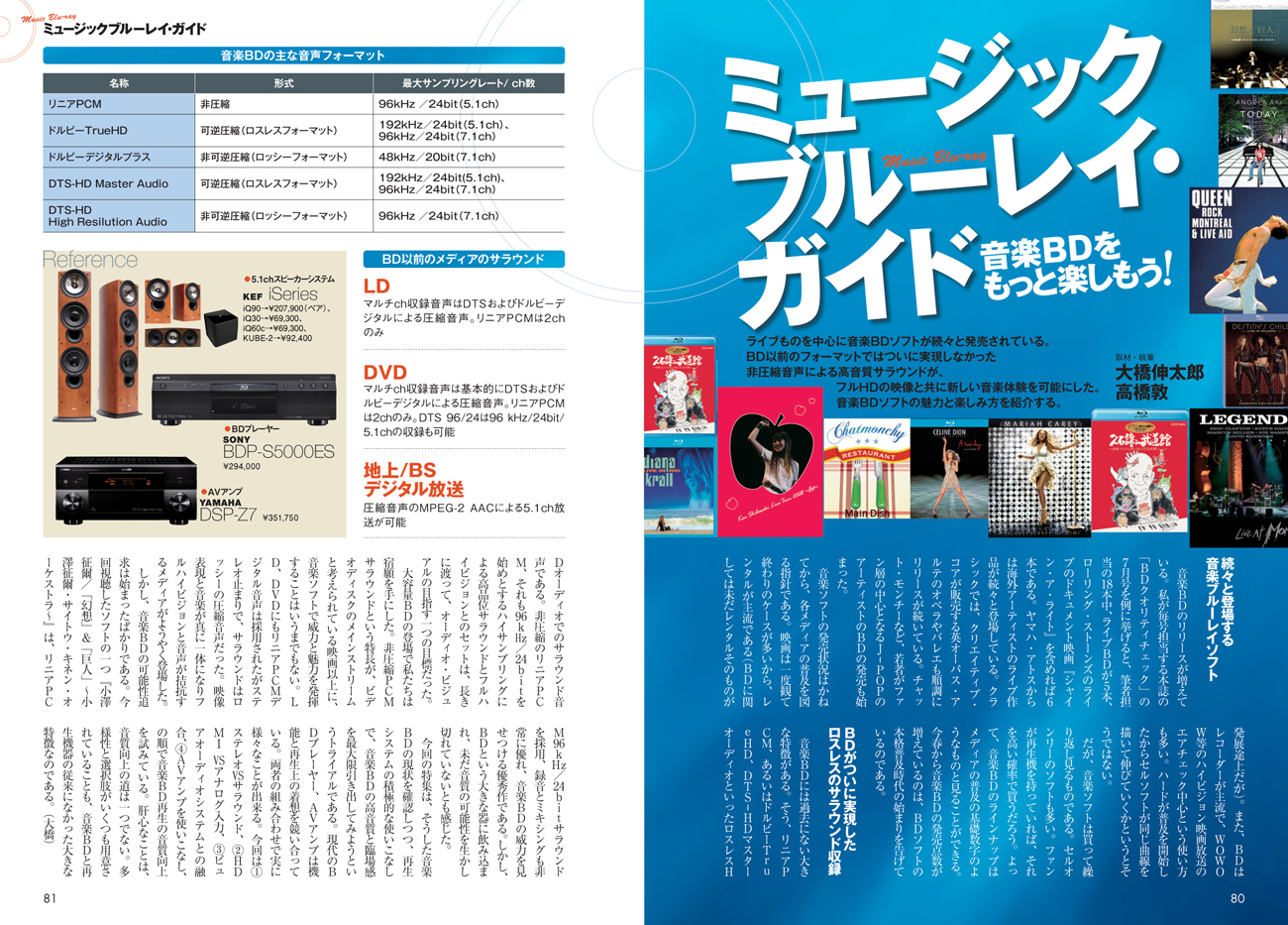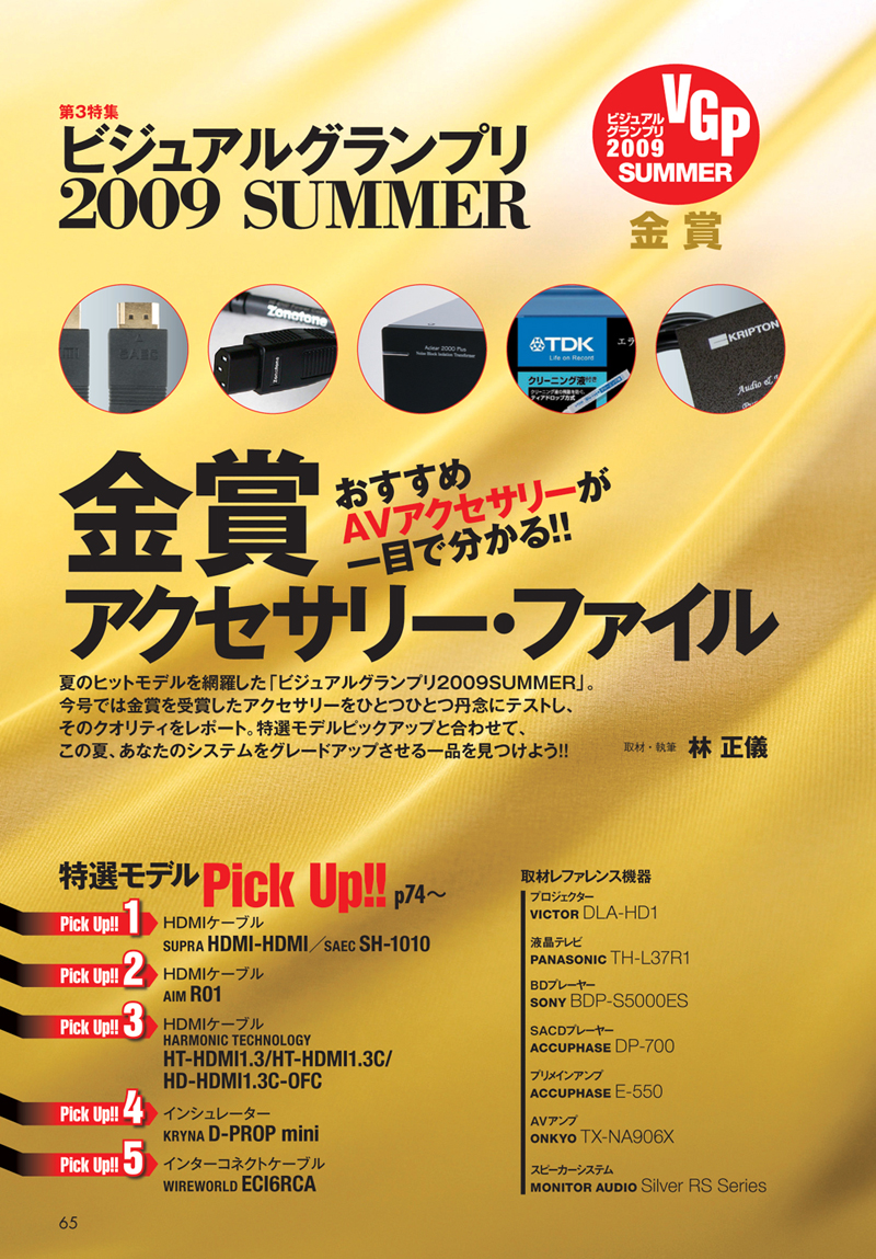 画像をクリックして拡大 夏のヒットモデルを網羅した「ビジュアルグランプリSUMMER」。今号では金賞を受賞したアクセサリーをひとつひとつ丹念にテストし、そのクオリティをレポートしていきます。特選モデルピックアップと合わせ、この夏、あなたのシステムをグレードアップする一品がきっと見つかるはずです。 第4特集 ミュージックブルーレイ・ガイド