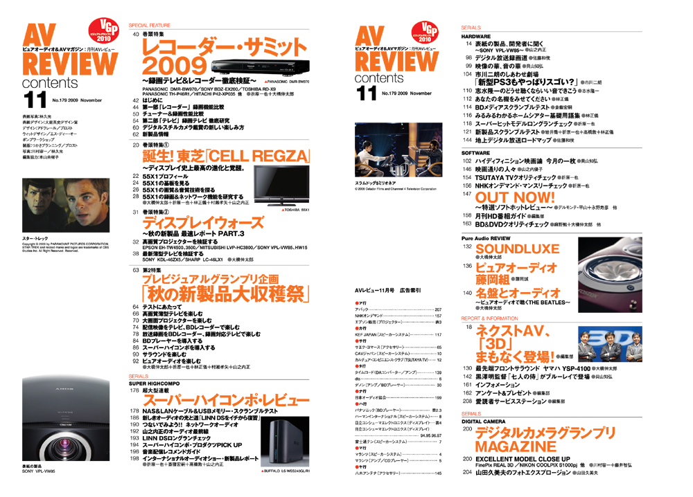 東芝からついに登場するCELL REGZAの最速レポート「ディスプレイ史上最高の真価と覚醒 CELL REGZA」、最新ディスプレイを一挙にレポートした「秋の新製品 最速レポート PART.3 ディスプレイ・ウォーズ」、レコーダーの最前線がまるわかりの「レコーダーサミット2009」、ビジュアルグランプリ2010の主役となるであろう製品が一同に集結した「秋の新製品 大収穫祭」など、今月号もあなたのAVライフを熱くする情報をお送りしていきます。ぜひお手にとってご覧ください。