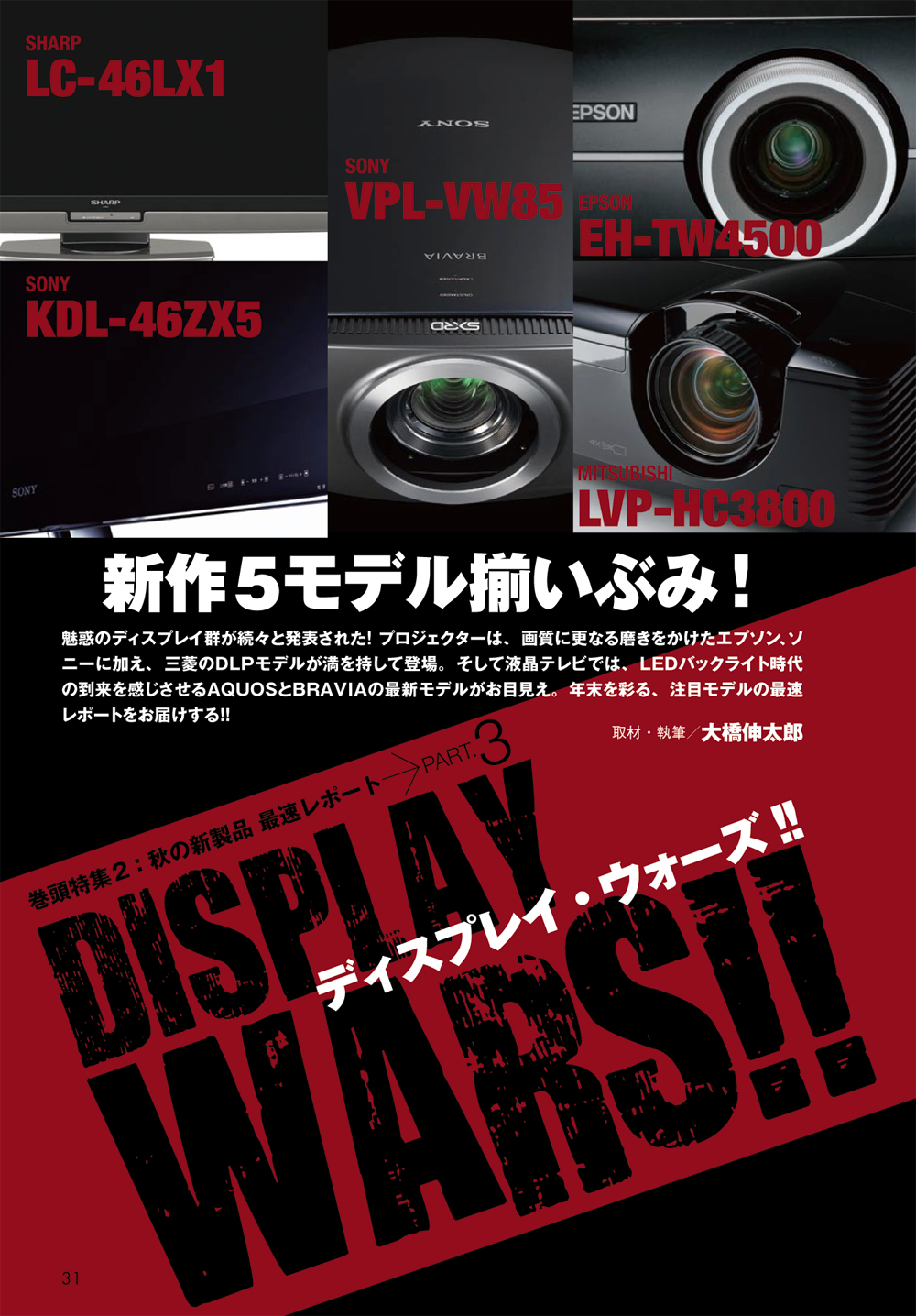 魅惑のディスプレイたちが続々と発表されました! プロジェクターは、画質にさらに磨きをかけたエプソン、ソニーに加え、三菱のDLPモデルが満を持して登場。そして液晶テレビでは、LEDバックライト時代の到来を感じさせるAQUOSとBRAVIAの最新モデルがお目見え。年末を彩る、注目モデルの最速レポートをお届けする。