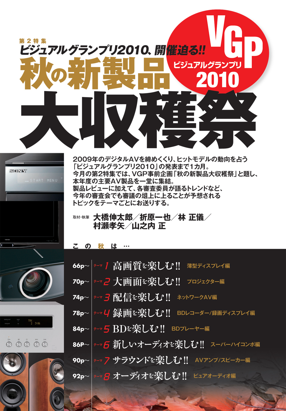 2009年のデジタルAVを締めくくり、2010年のヒットモデル動向を占う「ビジュアルグランプリ2010」の発表まであと1か月。第2特集では、ビジュアルグランプリ直前企画として、「秋の新製品・大特集」と題し、本年度の主要AV製品を一斉レポート。製品レビューに加え、各審査員が語るトレンドなど、今年の審査会でも審議の俎上に上がることが予想されるトピックをテーマごとにお送りします。
