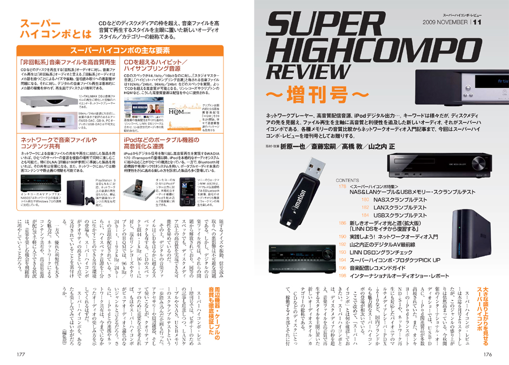 ネットワークプレーヤー、高音質配信音源、iPodデジタル出力…。キーワードは様々ですが、ディスクメディアの先を見据え、ファイル再生を主軸に高音質と利便性を追及した新しいオーディオ、それがスーパーハイコンポです。各種メモリーの音質比較からネットワークオーディオ入門書まで、今回はスーパーハイコンポ・レビューを増刊号としてお贈りします。