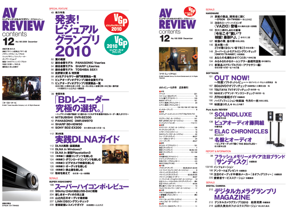 AV REVIEW 12月号は、2009年のオーディオ&ビジュアルシーンを総括し、2010年の動向を占う「ビジュアルグランプリ2010」の発表号です。