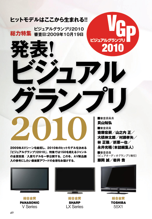 2009年のAVシーンを総括し、2010年のヒットモデルを決定する「ビジュアルグランプリ2010」。特集では150を超えるジャンルの金賞受賞/入賞モデルを一挙公開します。この冬、AV製品購入の参考にした最重要アワードの全容をお届けします。