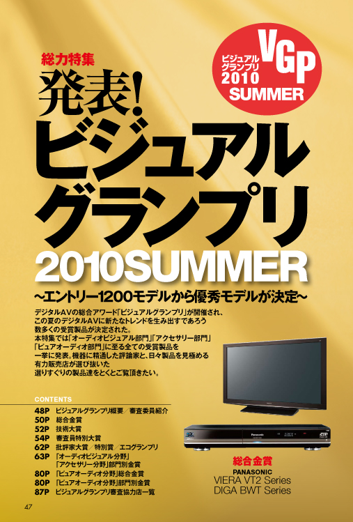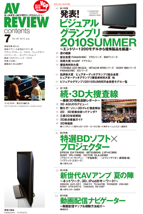 AV REVIEW 7月号ではビジュアルグランプリ2010 SUMMERがついに発表となります。1200を超えるエントリーの中から厳しい審査を経て選出された各賞の受賞製品が本誌にて一挙掲載。夏のヒット商品になること間違いなしの受賞製品は一体どのモデルなのか、必見です。また、3Dの最前線をお伝えする特集記事から各種人気連載まで、今号のAV REVIEWも盛りだくさんの内容でお伝えしていきます。ぜひお手にとってご覧ください。 第1特集続・3D大捜査線