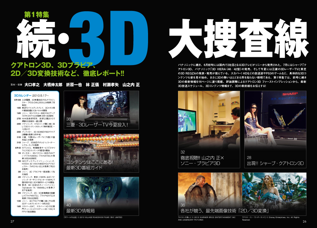 パナソニックに続き、6月初旬には国内で2社目となる3Dテレビがソニーから発売されました。さらに7月にはシャープ「クアトロン3D」、パナソニック「3D VIERA (46/42型)」の発売、そしてこの夏には三菱の3Dレーザーテレビと東芝の3D REGZAの発表・発売が控えています。スカパー!HDなどの放送波やPS3のゲームなど、ぐたいてきな3Dコンテンツも姿を見せ始め、まさに3Dの勢いはとどまるところを知りません。第1特集では、前号に続き3Dの最新情報を16ページにわたり掲載します。 第2特集特選BDソフト×プロジェクター