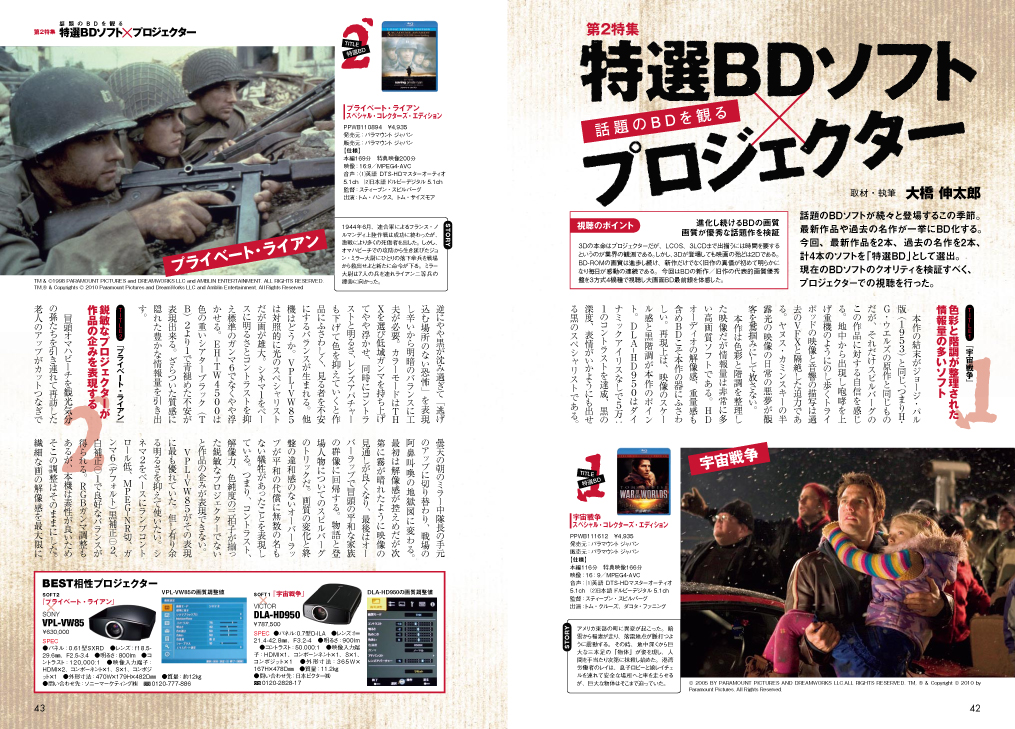 話題のBDソフトが続々と登場するこの季節。最新作や過去の名作が一挙BD化されます。今回、『宇宙戦争』、『プライベート・ライアン』、『パブリック・エネミーズ』、『ヱヴァンゲリヲン新劇場版:破』という最新BDソフト4本を各社のプロジェクターで視聴。各組み合わせでどのような画質が実現するのか、各BDの魅力を最大限引き出すプロジェクターはどのモデルなのかをレビューしていきます。 総力特集発表! ビジュアルグランプリ2010SUMMER