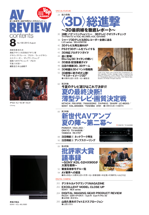 AV REVIEW 8月号では3Dテレビ、3D関連製品、そして3Dコンテンツを網羅した「3D総進撃」をお届けします。パナソニックとソニーの3Dテレビ直接対決から日本発売の3D BDとなる「タイタンの戦い」などのソフト情報まで、3Dの最前線まるわかりの内容です。「夏の最終決断! 薄型テレビ・画質決定戦」では、現行モデルにおけるハイエンドからエントリーまで18モデルの画質を徹底検証。テレビ購入を考えている方にはマストなクオリティチェックとなっています。今号のAV REVIEWも盛りだくさんの内容でお伝えします。ぜひお手にとってご覧ください。 総力特集3D総進撃 <3D>最前線を徹底レポート