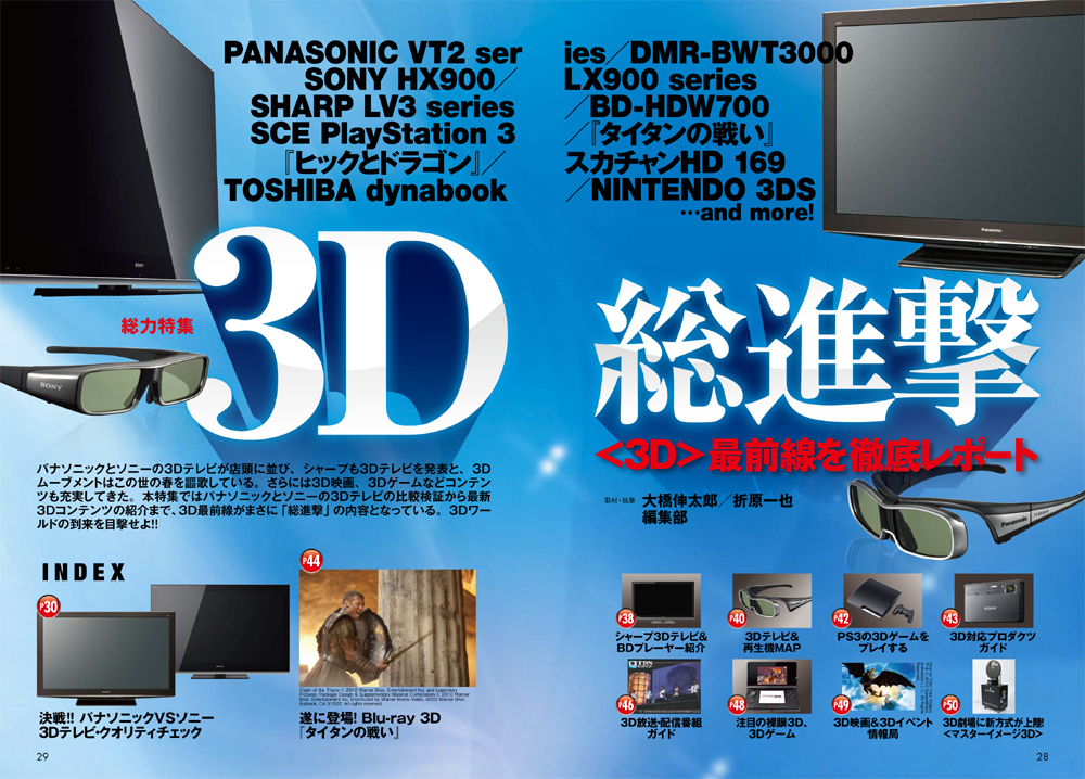 パナソニックとソニーの3Dテレビが店頭に並び、シャープも3Dテレビを発表しました。3Dムーブメントはまさに満開といった様相を呈しています。本特集では、パナソニックVSソニーの3Dテレビの3D再生検証を軸とした直接対決、ソニー機の2D/3D変換の検証から、3D BD、3D放送、ゲームなどコンテンツの情報まで、3Dの最前線を完全網羅した内容となっています。3Dワールドの到来を目撃してください!! 第2特集夏の最終決断薄型テレビ 画質決定戦!