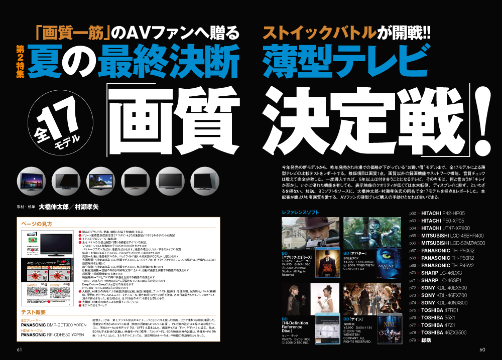 今年発売の新モデルから、昨年発売され市場での価格が下がっている「お買い得」モデルまで、全17モデルによる薄型テレビの比較テストをレポートします。検証項目は画質の1点です。1度導入すれば5年は付き合うことになるテレビ。その最大の関心事はなんといっても「画質」です。今回の取材では大橋伸太郎氏・村瀬孝矢氏の両名が放送とBDソフトをレファレンスに採点&レポートを行いました。誰よりも高画質を愛するAVファンの方々へ、薄型テレビ購入の手助けとなれば幸いです。 第3特集新世代AVアンプ 夏の陣<第2幕>