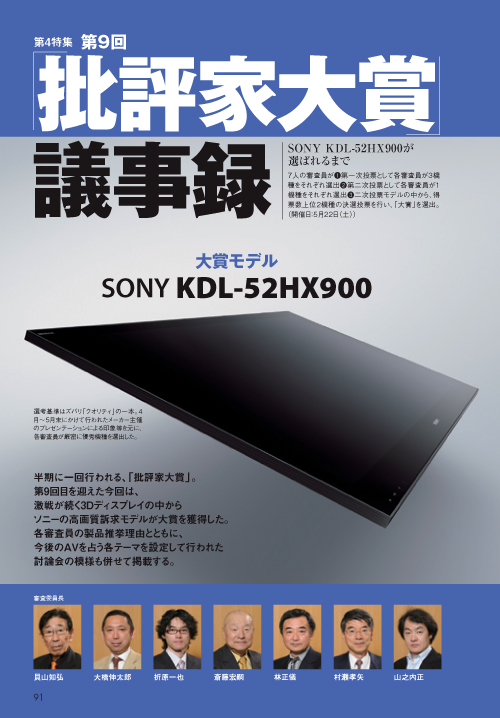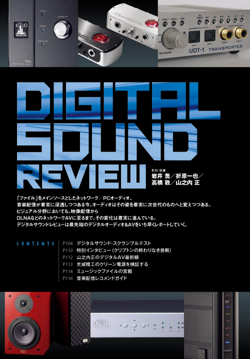 半期に1回行われる「批評家大賞」。第9回目を迎えた今回は、激戦が続く3Dディスプレイの中からソニーの高画質訴求モデルKDL-52HX900が大賞を獲得した。各審査員の製品推挙理由と共に、今後のオーディオ・ビジュアルの同行を占う各テーマを設定して行われた討論会の模様も合わせて掲載します。 デジタルサウンド・レビュー盛り上がりを見せているPC/ネットワークオーディオや音楽配信の最新情報&使いこなしテクニックを紹介していくデジタルサウンド・レビュー。「デジタルサウンド・スクランブルテスト」では、コードのヘッドホンアンプChordette Toucan、ニューフォースのヘッドホンアンプ/DACのiCON- HDPなどをレビュー。人気連載「ミュージックファイルの宮殿」では音楽ファイルの管理&整理のテクニックついて解説します。今欲しいPC/ネットワークオーディの情報が満載の内容です。 好評連載中