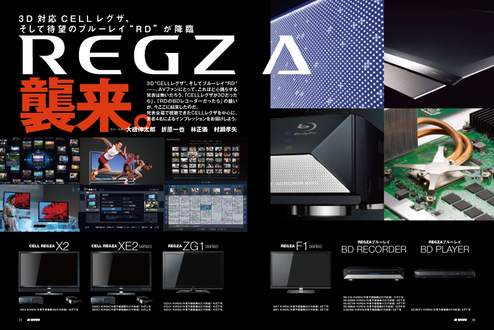 9月号の第1特集は「激震!3Dテレビ・ウォーズ」。続々と登場する3Dテレビの最新情報とクオリティ対決レポートをお伝えします。また、第2特集はネットオーディオの導入記事からネットワークプレーヤーのスクランブルテストまでを網羅した「ネットオーディオ解体新書」、第3特集はジャンル別にアクセサリーの使いこなしのポイントを解説した「ジャンル別アクセサリー活用法」、第4特集は「AV的iPod&iPhone活用術」というラインナップでお贈りします。人気連載記事も満載です。 巻頭記事REGZA襲来。