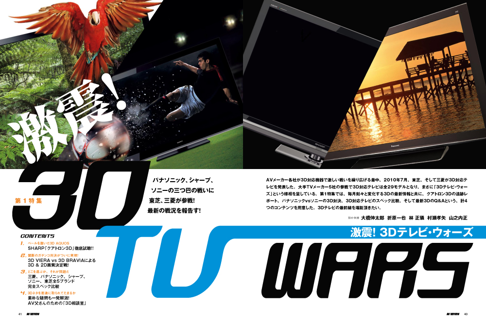 AVメーカー各社が3D対応機器で激しい戦いを繰り広げる中、パナソニック、ソニー、シャープに続き東芝、三菱が3Dテレビを発表しました。大手5社の参戦で3D対応テレビは全29機種となり、まさに「3Dテレビ・ウォーズ」という様相を呈しています。本特集では3Dの最新情報と共に、クアトロン3Dの追跡レポート、パナソニックVSソニーの3D対決、そして3DのQ&Aと、3D最前線をレポートしていきます。 第2特集ネットオーディオ解体新書