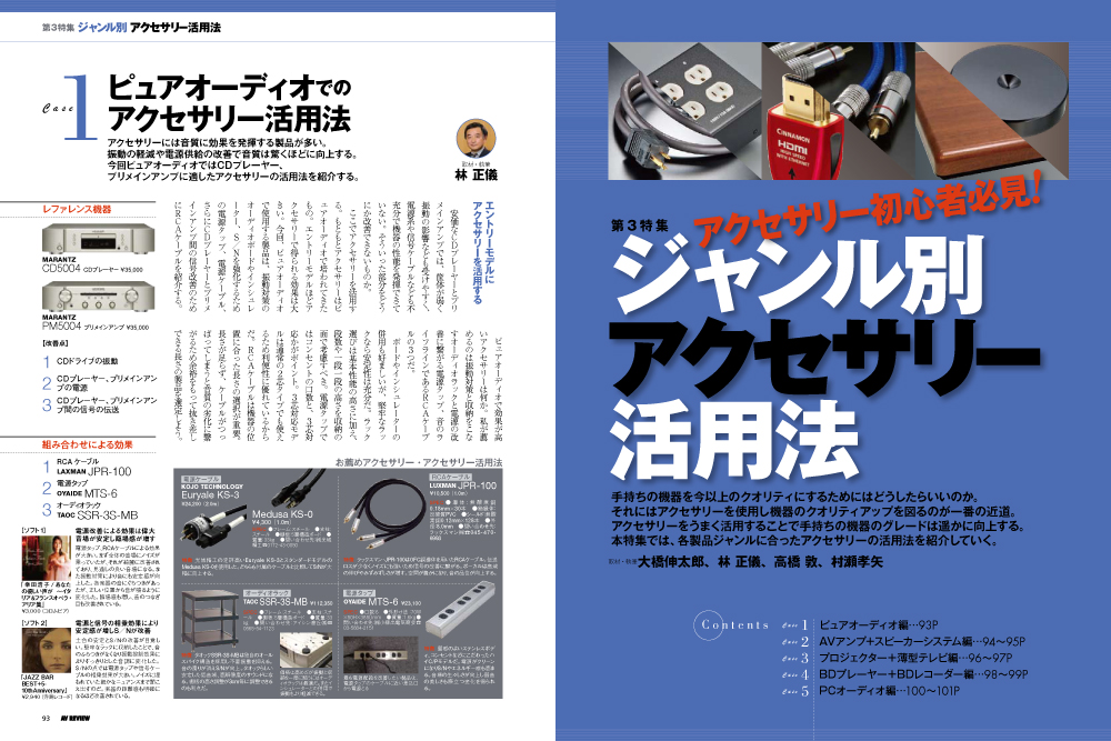 NASに保存した音楽ファイルをネットワーク経由で再生。従来のディスク再生を凌駕する音質と、iPod以降の音楽試聴スタイルの親和性の高さが、「ネットオーディオ」をメインストリームへと押し上げました。本特集では、導入への手引きとなる「本気で始めるネットオーディオ・ガイド」、そして再生機10モデルの音質を検証した「ネットワークプレーヤー・スクランブルテスト」の2部構成で、この魅惑的な新世界をわかりやすく、かつ深く、ひも解いていきます。 第3特集ジャンル別アクセサリー活用法