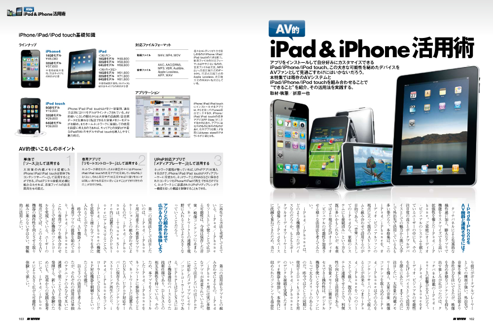 手持ちの機器を今以上のクオリティに引き上げるためにはどうすればいいのでしょうか。それにはアクセサリーを使用し機器のクオリティアップを図るのが一番の近道です。本特集ではオーディオからビジュアルまで各製品ジャンルにあったアクセサリーの紹介、そして使いこなしをレクチャーしていきます。 第4特集AV的iPad/iPhone活用術