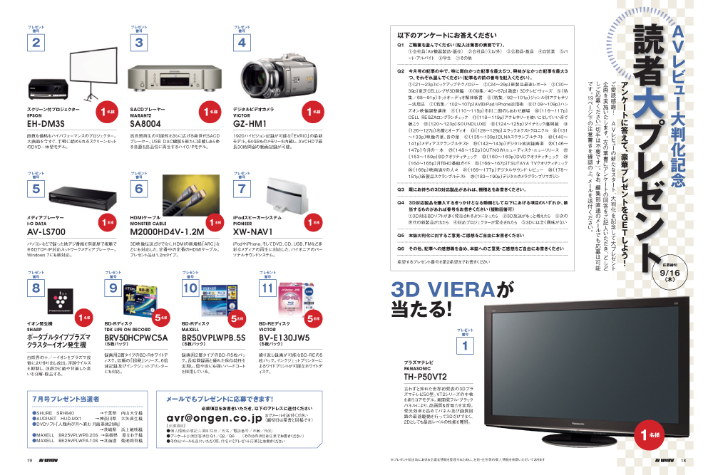 AV REVIEW 9月号では大判化第1号を記念して、超豪華なご愛読者プレゼントを実施します。プレゼントの目玉は、なんとパナソニックの3D VIERAの50型、TH-P50VT2!! 他にもマランツのUSB-DAC内蔵SACDプレーヤーSA8004やエプソンのプロジェクターEH-DM3Sなど、超豪華プレゼントが目白押しです。詳しい応募規定は本誌をご確認ください。多数のご応募をお待ちしております。 9月号目次大判化第1段となるAV REVIEW 9月号は、東芝3D