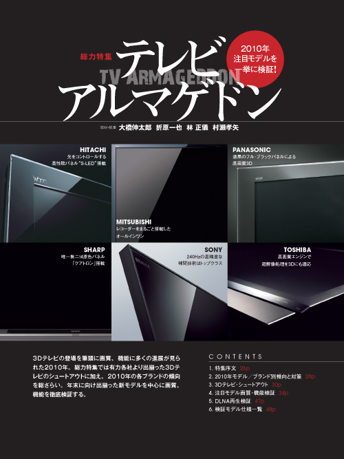 3Dテレビの登場を筆頭に画質、機能に多くの進展が見られた2010年。総力特集では有力各社より出そろった3Dテレビのシュートアウトに加え、2010年の各ブランドの製品の傾向を総ざらいします。現行エコポイント制度の終了が迫る中、テレビ購入を真剣に考えている方には必読となる、最新モデルの画質、機能を徹底検証していきます。 第2特集秋の新製品・大収穫祭