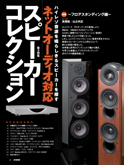 ネットワークオーディオやPCオーディオなどのいわゆる「ネットオーディオ」が登場したことで、96kHz/24bitなどCDスペックを凌駕するハイレゾリューション音源を楽しむことが可能になりました。「ハイレゾリューション音源を再生するのに最適なスピーカーシステムは何か」をテーマとした本特集。後編の今回はフロアスタンディング型20モデルの徹底検証を行いました。 巻末特集Net Audio Samplerガイドブック