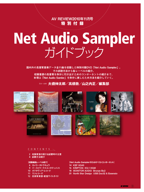 AVレビュー11月の特別付録であるDVD「Net Audio Samler」 には、国内外の高音質音楽データ全11曲が収録されています。これら高音質音源の基本的な試聴方法から各レーベルの紹介、収録音源の高音質を存分に引き出すためのコンポーネントの紹介まで、本項は「Net Audio Samler」を存分に楽しむため方法を紹介していきます。 好評連載中