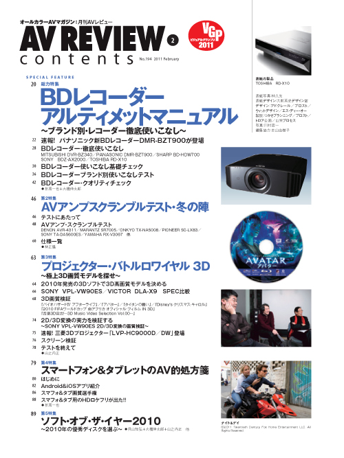 関係者ならびに読者の皆様にご迷惑をおかけしたことをお詫び申し上げます。 2月号目次AV REVIEW 2月号はBDレコーダーの徹底使いこなし&最新製品の速報、3DプロジェクターやAVアンプのクオリティチェック、スマートフォンのススメ、恒例のソフト・ベスト10と必読の情報満載です。 総力特集ではパナソニックから登場した脅威のBDレコーダー新製品の最速レビュー、そしてブランド別のBDレコーダー徹底使いこなしをお届します。第2特集はミドル〜ハイクラスの実力派AVアンプを一堂に会し、サラウンド再生能力に的を絞ったテストを行いました。第3特集では3Dプロジェクター各モデルの実力をチェック、第4特集はスマートフォンのAV的使いこなしを紹介します。第5特集は恒例となったBDソフトのベスト10発表です。もちろんNet Audio情報も満載です。AVファン必読のAVレビュー2月号、ぜひお手にとってご覧ください。 総力特集BDレコーダー・アルティメットマニュアル