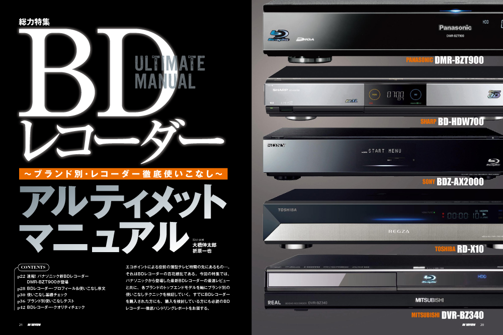 エコポイントによる空前の薄型テレビ特需の先にあるもの…。それはBDレコーダーの百花繚乱です。今回の特集では、パナソニックから登場した最新BDレコーダーの最速レビューと共に、各ブランドのトップエンドモデルを軸にブランド別の使いこなしテクニックを検証していきます。すでにBDレコーダーを購入された方にも、購入を検討している方にも必読のBDレコーダー・徹底ハンドリングレポートをお届けいたします。 第2特集AVアンプスクランブルテスト・冬の陣