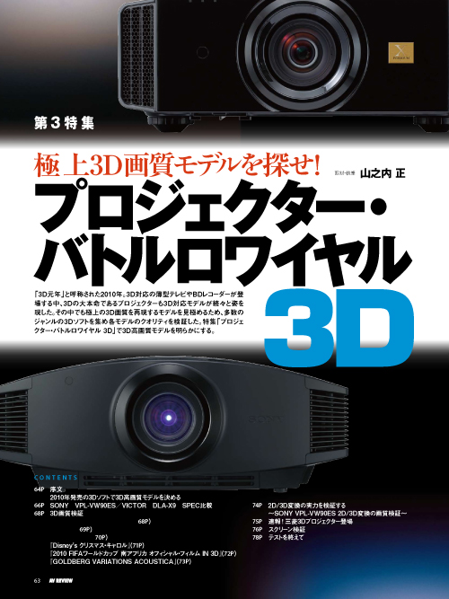 ネットワーク機能の進化など、AVシステムの中核としての役割に注目が集まるAVアンプですが、一番の肝となるのはやはり音質でしょう。映像の3D化が進み“音”にもより一層の臨場感が求められる今、本特集では原点に戻り、AVアンプの第一義である音質に的を絞った一斉試聴を敢行。昨年夏以降に登場した最新AVアンプのミドル〜ハイクラス機を一同に集め、5.1chマルチ再生、2chステレオ再生の実力をそれぞれ詳細に検証します。 第3特集プロジェクター・バトルロワイヤル 3D〜極上3D画質モデルを探せ〜