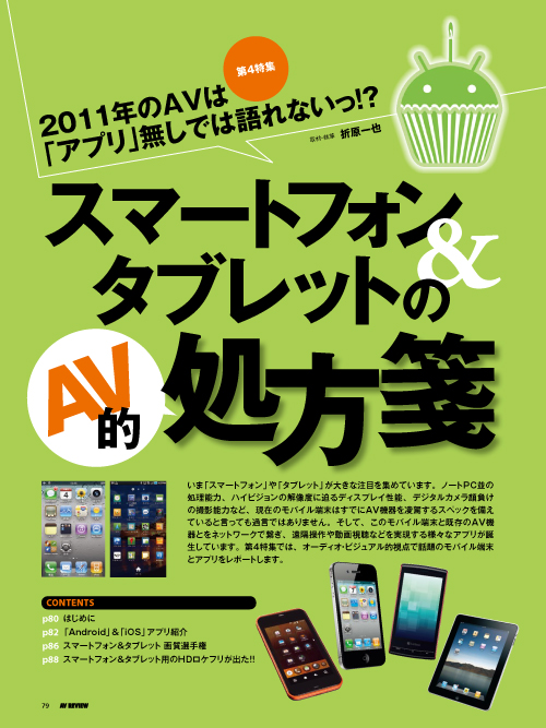 今、「スマートフォン」や「タブレット」が大きな注目を集めています。ノートPC並みの処理能力、ハイビジョン解像度に迫るディスプレイ性能、デジタルカメラ顔負けの撮影能力など、現在のモバイル端末はすでにAV機器に迫るスペックを備えているといって過言ではありません。そして、このモバイル端末と既存のAV機器とをネットワークでつなぎ、遠隔操作や動画視聴などを実現する様々なアプリが誕生しています。第4特集では、AV的視点から話題のモバイル端末とアプリをレポートします。 第5特集ソフト・オブ・ザ・イヤー2010〜2010年の優秀ディスクを選ぶ〜