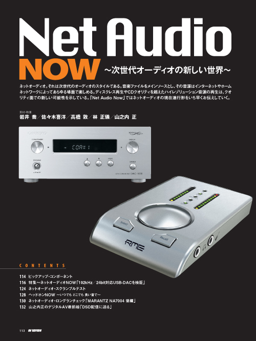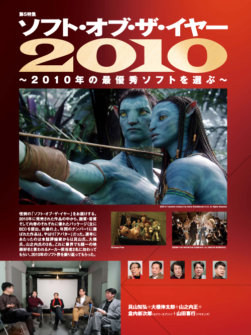 恒例となった「ソフト・オブ・ザ・イヤー」をお届けします。2010年に発売された作品の中から、画質、音質、そして内容のそれぞれに優れたパッケージ(主にBD)のベスト10を各審査員が提出。合議の上、年間のナンバー1に選ばれたのは、やはり『アバター』でした。選考にあたったのは、本誌評論家から貝山氏、大橋氏、山之内氏の3名。これに業界でも随一の映画好きと言われるメーカー担当者2名に加わっていただき、2010年のソフト動向を振り返っていただきました。 NET AUDIO NOWネットオーディオ。それは次世代のオーディオのスタイルです。音楽ファイルをメインソースとし、その音源はインターネットやホームネットワークによってあらゆる場面で楽しむことができます。ディスクレス再生やCDクオリティを超えたハイレゾリューション音源の再生は、クオリティ面での新しい可能性を示していると言えるでしょう。「Net Audio Now」ではネットオーディオの現在進行形をいち早くお伝えしていきます。 好評連載中