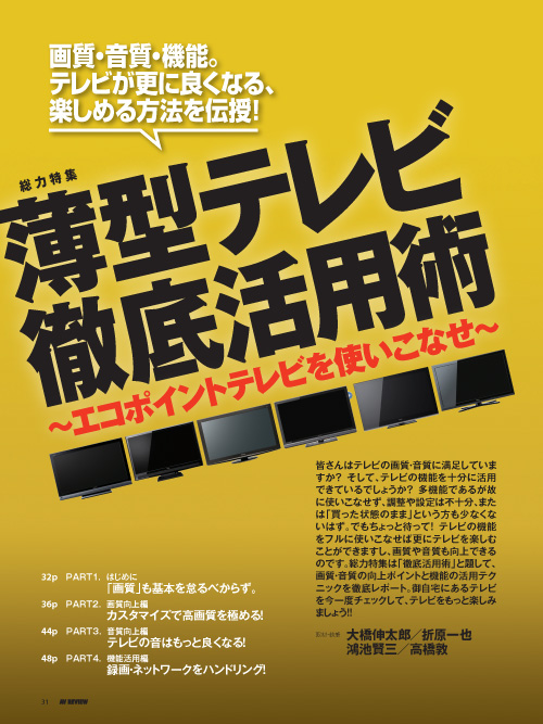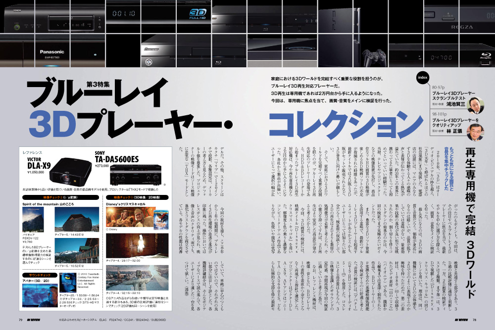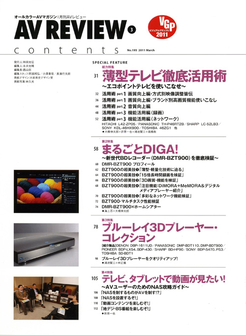 関係者ならびに読者の皆様にご迷惑をおかけしたことをお詫び申し上げます。 3月号目次AV REVIEW 3月号は薄型テレビの徹底使いこなしやパナソニック最新BDレコーダーの徹底使いこなし、スマートフォンを楽しむためのNASマニュアル、そして最新の製品情報と今月もAVファン必読の情報が満載です。 総力特集では薄型テレビを画質/音質/機能というそれぞれの角度から徹底的に使いこなしていきます。第2特集ではパナソニックの最新にして最高峰のBDレコーダーDMR-BZT900をまるごとハンドリングしてその潜在能力に迫ります。第3特集は3D対応BDプレーヤーのクオリティチェック、第4特集ではAVユーザーに向けたNASのガイドをお届けします。もちろん、最新製品の速報やNet Audio情報も満載です。AVファン必読のAVレビュー3月号、ぜひお手にとってご覧ください。 総力特集薄型テレビ徹底活用術〜エコポイントテレビを使いこなせ〜