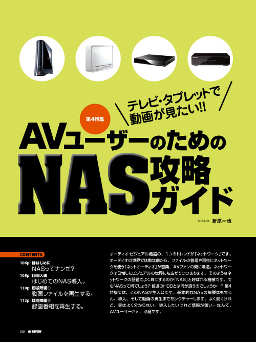 家庭における3Dワールドを完結するべく重要な役割を担っているのが、ブルーレイ3D再生対応プレーヤーです。今や3D再生は専用機であれば2万円台から手に入るようになりましたが、果たして、その再生クオリティはモデルごとにどのような個性を持っているのでしょうか。本特集は3Dに対応した再生専用機に焦点を当て、画質・音質を中心に検証を行いました。 第4特集AVユーザーのためのNAS攻略ガイド
