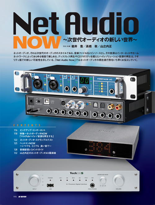 AV機器のトレンドのひとつに「ネットワーク」があります。オーディオの世界では数年前から、ファイルの管理や再生にネットワークを使う「ネットオーディオ」が浸透してきました。そして、ネットワークは今、ビジュアルにおいても広がりつつあります。こうしたネットワークの世界でよく耳にするのが「NAS」という言葉。第4特集ではNASの基本的な解説はもちろんのこと、導入の方法、そして動画の再生までをレクチャーしていきます。これからNASを導入しようとしている方も、まだNASの魅力に気づいていない方も、必見です。 NET AUDIO NOWネットオーディオ。それは次世代のオーディオのスタイルです。音楽ファイルをメインソースとし、その音源はインターネットやホームネットワークによってあらゆる場面で楽しむことができます。ディスクレス再生やCDクオリティを超えたハイレゾリューション音源の再生は、クオリティ面での新しい可能性を示していると言えるでしょう。「Net Audio Now」ではネットオーディオの現在進行形をいち早くお伝えしていきます。 好評連載中