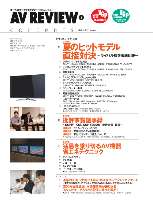 8月号目次AVレビューは8 月号にて、ついに通巻200号&大判化1周年を迎えます。それを記念して、豪華・大読者プレゼントも企画しました。 AVレビュー8月号は通巻200号、そして大判化から1周年を迎えての記念号となります。そして、日頃から本誌をご愛顧いただいています読者の皆様への感謝の気持ちを込めて、大読者プレゼントを行います。プレゼントにはなんと、パナソニックのプラズマテレビ「VT3」やBDレコーダー「BZT900」、東芝の液晶テレビ「ZG2」などもご提供いただきました。奮ってご応募ください!! 総力特集夏のヒットモデル直接対決〜ライバル機を徹底比較〜