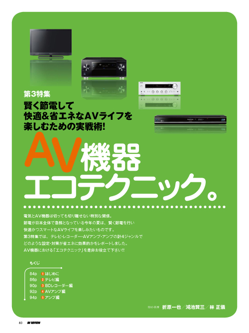 電気とAV機器は切っても切り離せない特別な関係。節電が日本全体で急務となっている今年の夏は、賢く節電を行い、快適かつスマートにAVライフを楽しみたいものです。第3特集では、テレビ、レコーダー、AVアンプ、ピュアオーディオの4ジャンルで、どのような設定や対策が省エネに効果的かをレポートしました。AV機器における「エコテクニック」をぜひお役立てください! 観たぞ! 有機ELマスターモニター!!