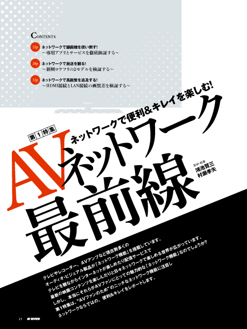 テレビやレコーダー、AVアンプなど現在多くのオーディオ・ビジュアル製品が「ネットワーク機能」を搭載しています。テレビを観ながらインターネットが楽しめたり、配信サービスで最新の映画コンテンツを楽しんだり、日々ネットワークで楽しめる世界が広がっています。しかし、それらは本当に、AVファンにとって魅力的な「ネットワーク機能」なのでしょうか。第1特集は“AVファン“のためのニッチなネットワーク機能に注目し、そこで実現する便利&キレイをレポートしていきます。 第2特集今こそディスク再生を極める! BDプレーヤー・セレクション