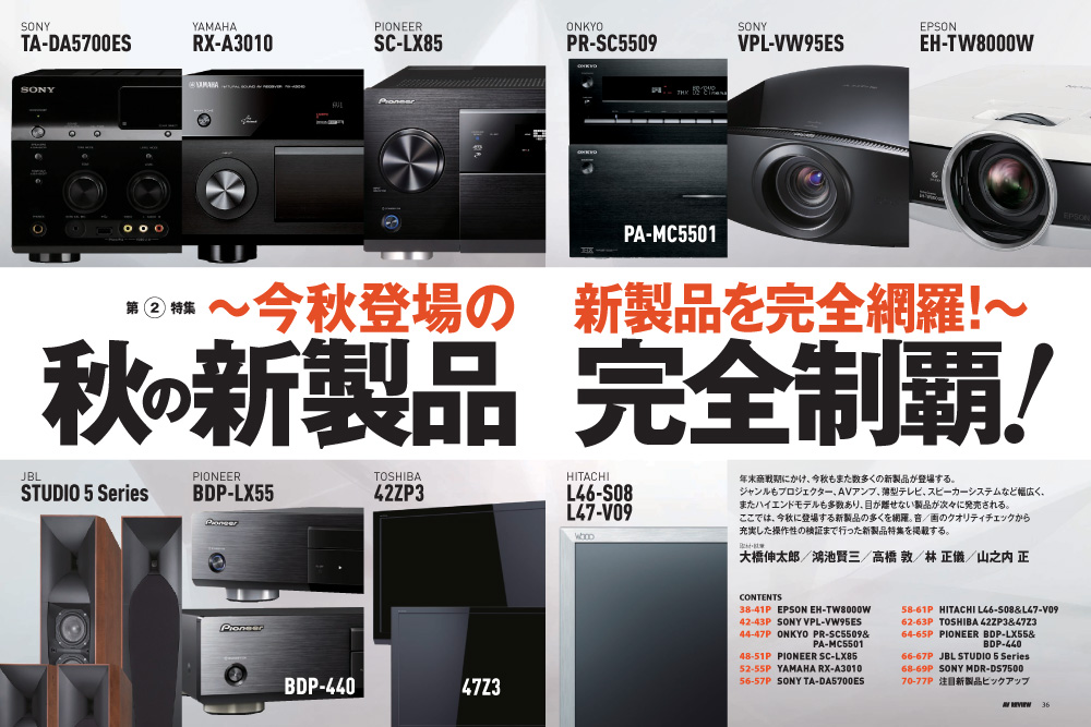 〜秋の新製品・完全制覇! 今年も、新製品の季節がやってまいりました。ジャンルもプロジェクター、AVアンプ、薄型テレビ、スピーカーシステムなど幅広く、AVファン感涙のクオリティ重視モデルも多数登場しています。本特集では、今季の新製品群を網羅、画/音のクオリティチェックから操作性の検証までを行った。 第3特集秋の大本命、ここにあり!!