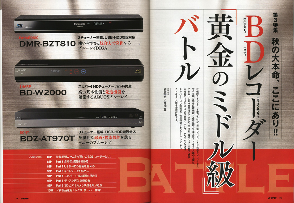 『BDレコーダー<黄金のミドル級>バトル』 圧倒的なトップエンド機が各社から登場した2011年秋のBDレコーダー。一方、手頃な価格に高機能/高再生能力を備えたミドルクラス機の充実は、それ以上に目を見張るものがあります。まさに「黄金のミドル級」の時代! 本特集ではUSB-HDD録画、ネットワーク&スマフォ連携、スカパー!HD録画など旬の機能にもフォーカスしながら、ミドルクラス機を集中解析します。 大型連載Net Audio NOW