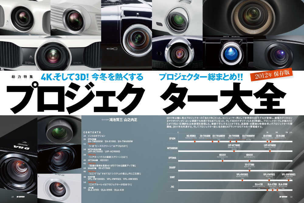 1月号寒い冬こそ、家の中で充実したオーディオ&ビジュアルライフを送ろう!ということで、AVレビュー1月号は、新製品が欲しい、クオリティをもっとアップしたい、オススメBDソフトが知りたいという全AVファンの皆様必読の内容となっております。総力特集は、「2012年保存版プロジェクター大全」。圧倒的な取材量と測定データを元に、3D&4Kプロジェクターの現行モデルのほとんどを徹底レビューしていきます。さらに、続々と始まる新連載にもよう注目です。書店へ急げ!! 大型新連載HYPER B-LINK! ニューリリース・BDソフト「数珠繋ぎ」