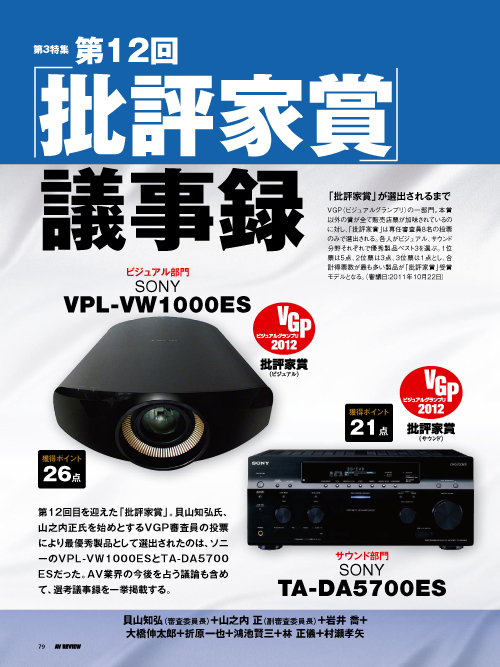 ビジュアルグランプリ2012において、「製品のクオリティ」にフォーカスして選定された「批評家賞」。映像部門でソニーのVPL-VW1000ES、サウンド部門でも同じくソニーのTA-DA5700ESが「批評家賞」を獲得し、ソニーが二冠を獲得した。本特集では各審査員の選定理由、そしてオーディオ・ビジュアルの現在と未来について熱い議論が交わされた議事録を一挙掲載します。 第4特集オススメ3Dコンテンツとってだし!!