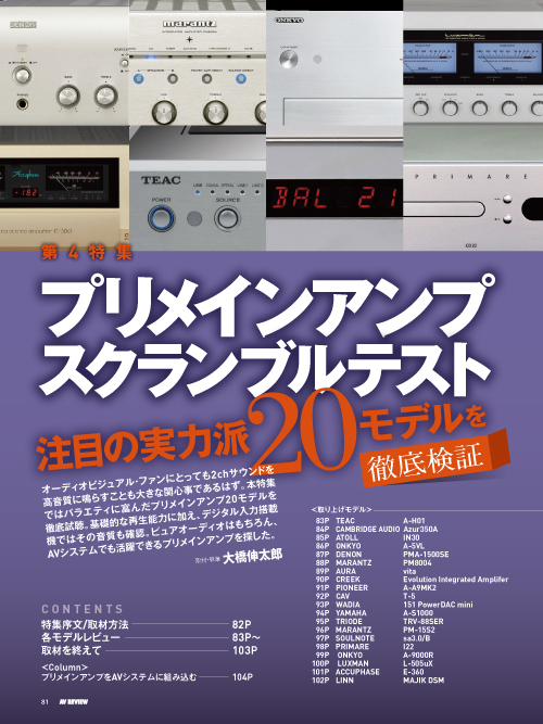 この冬、目の肥えたAVファンの注目を集めた4K対応の3モデル、ソニーVPL-VW1000WS、JVC DLA-X90R、東芝55X3。ネイティブ4Kコンテンツが存在しない今、従前のBDソフトをいかに美しく、精彩に表現できるかがポイントとなります。特集では最新BDソフト4タイトルを用意し、各モデルの4Kアップスケーリングにおける表現力を厳密にチェックしました。 第4特集プリメインアンプ・スクランブルテスト〜注目の20モデルを徹底検証