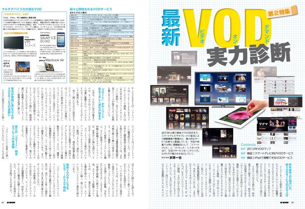 2012年は真の意味での「VOD元年」です。スマートテレビやタブレットの普及により試聴環境が整備され、魅力的なサービスも続々と登場しています。今回の特集では特に視聴端末として「スマートテレビ」と「タブレット」にスポットを当て、注目のサービスをハンドリングしてながらその魅力をお伝えしてきます。 第3特集ヒットモデルでAV"定説"を徹底検証! あたなのギモンに答えます