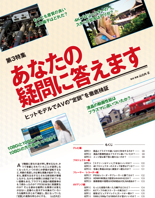 AV器機に変化の波が押し寄せる中、かつての常識が通用しなくなったり、いつのまにか評価が逆転するなど、判断の見直しが必要な現象が起きています。また、検証すべき新技術も続々登場しています。定番とも言えるヒットモデルを集めながら、AV器機への素朴な疑問を解決していくの特集のテーマです。今こそ、「定説」の真偽が明らかに。 好評連載中
