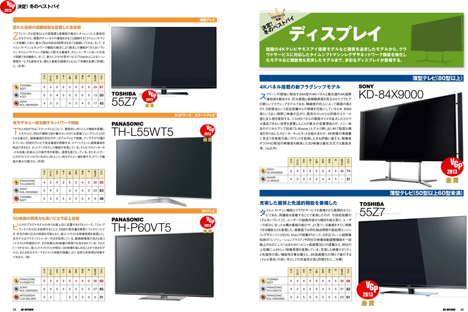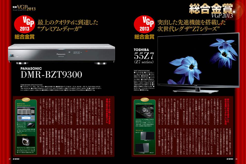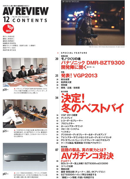 12月号AVレビュー12月号が17日に発売されました。今号の総力特集は「発表! VGP2013 & 決定! 冬のベストバイ」です。VGP2013は、2012年に発表発売されたオーディオ・ビジュアル機器から優秀なモデルに賞が贈られる国内最大のAVイベント。今年の栄えあるモデルはどれになるのか。各受賞モデルと合わせ、ベストバイプロダクトを発表致します。第2特集では、レコーダー&プロジェクターの注目モデルがガチンコバトルを開催した「AVガチンコ対決!!」。第1部は、パナソニックDMR-BZT9300vsソニーBDZ-EX3000のフラグシップレコーダー対決、そして第2部は、JVC DLA-X75RvsDLA-X70Rの新旧4Kプロジェクターが対決。どちらの戦いも、目が離せない試合となること必至!! そして第3特集は、今年を締めくくる新製品を一挙掲載しました。AVレビュー12月号を、是非お楽しみ下さい。 総力特集 前編発表! VGP2013
