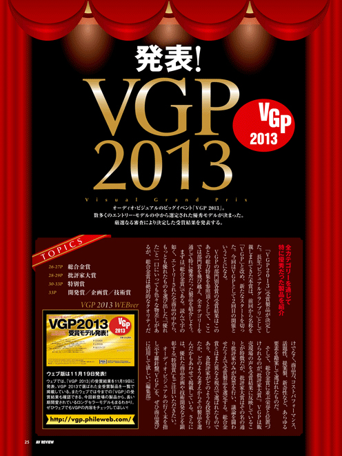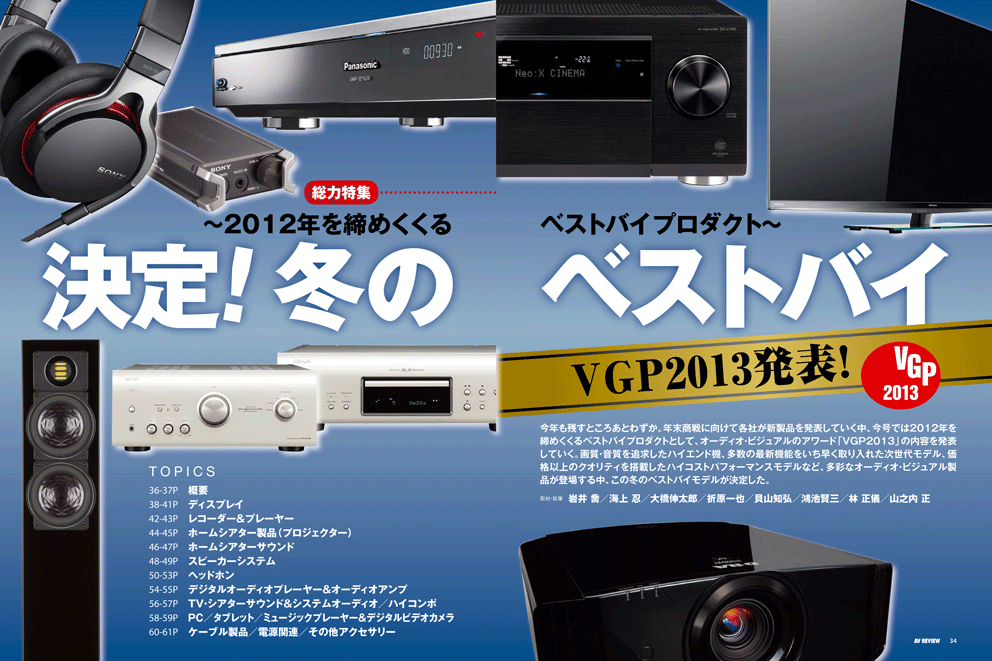 総力特集の前編は「発表! VGP2013」です。VGPは、オーディオ・ビジュアルの行く末を指し示す羅針盤とも言える、最大規模のAVアワードです。今年も数多くのエントリー・モデルの中から選定された優秀モデルが決まりました。厳正なる審査により選ばれた、記念すべき受賞モデル群を発表します。 総力特集 後編決定! 冬のベストバイ〜2012年を締めくくるベストバイプロダクト