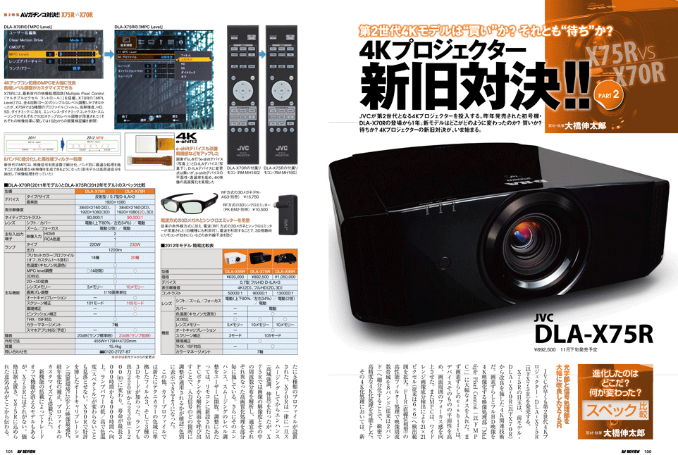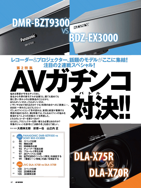 AVファンにとって、冬は悩める季節。各社から新モデル、フラグシップモデルが発表・発売され、毎年「旧モデルから何が変わったのか? ライバル機種とは何が違うのか?」と考えながら、カタログや雑誌をじっくりと見比べ妄想と欲望が葛藤する、そんな季節なのです。第2特集では、そのようなAVファンの悩みを解消するべく、2つの対戦カードを用意。第1試合は、フラグシップBDレコーダー対決「SONY BDZ-EX3000 vs PANASONIC DMR-BZT9300」。そして第2試合は、新旧4Kプロジェクター対決「JVC DLA-X75R vs DLA-X70R」。特集のジャッジを参考に「決断の冬」を迎えて下さい。 第3特集新製品Close Upレビュー