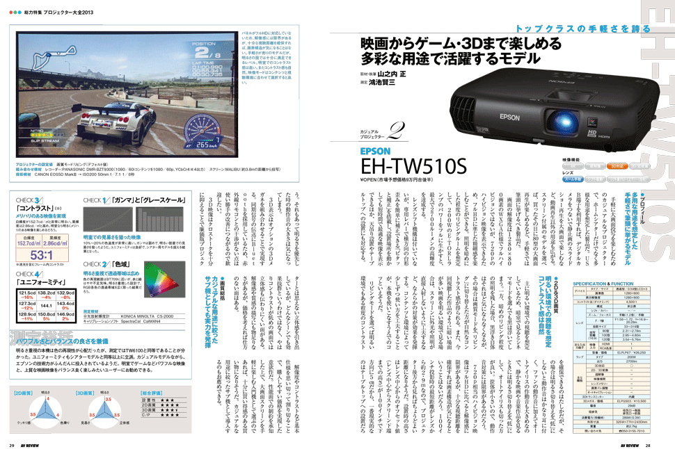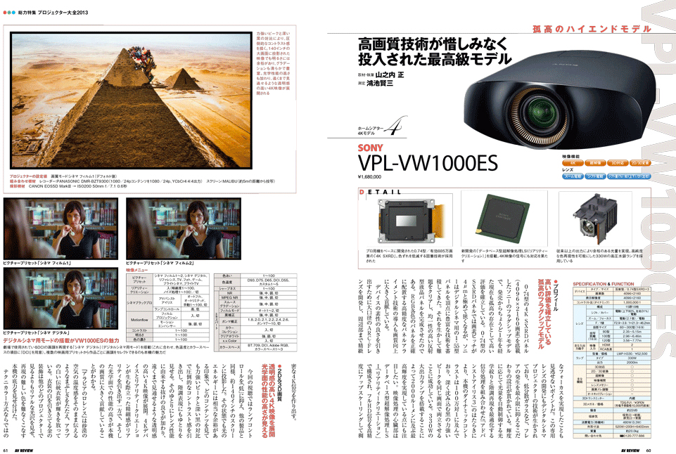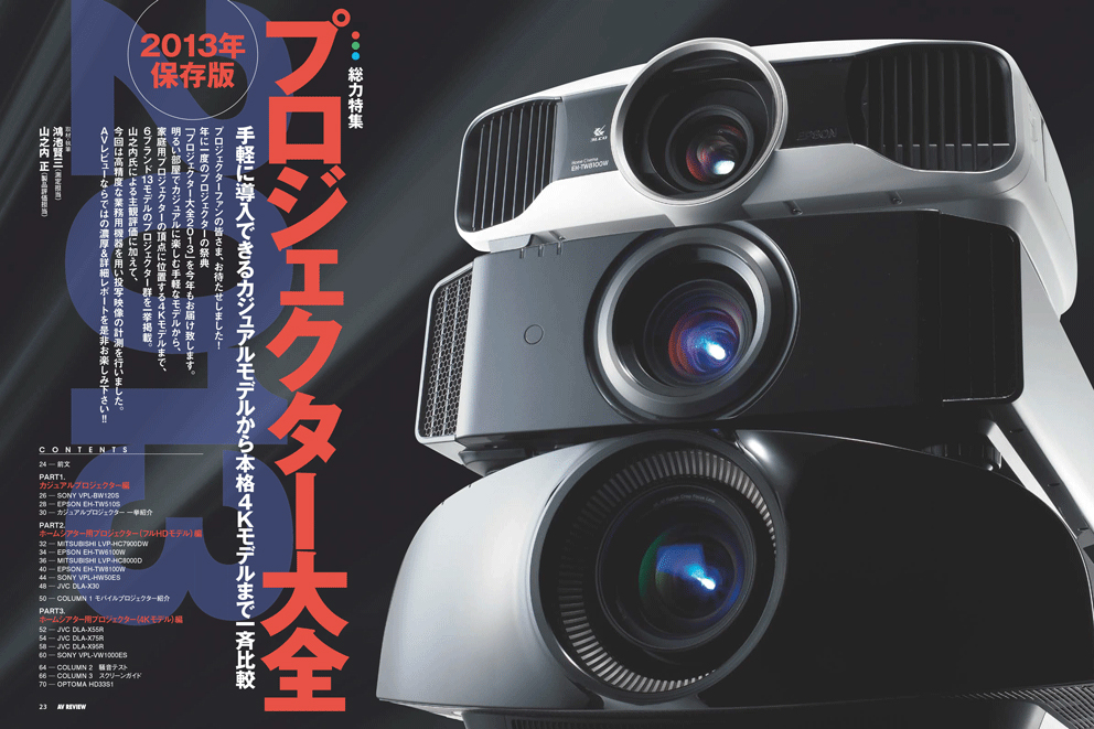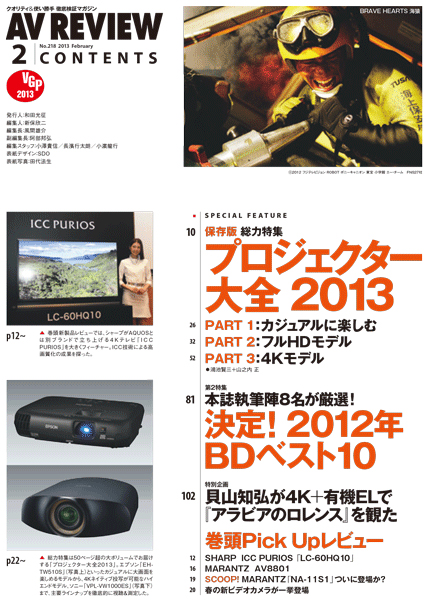 2月号AVレビュー2月号が17日に発売されました。今号の総力特集は「プロジェクター大全2013」です。10万円以下から始められるカジュアルプロジェクターから、超弩級の4K対応プロジェクターまで、全13モデルを取り揃えました。第2特集は本誌執筆陣8名が厳選した「決定! 2012年BDベスト10」です。巻頭新製品には、シャープの4Kテレビ「ICC PURIOS LC-60HQ10」の他、マランツのAVプリアンプ「AV8801」などを掲載。AVレビュー2月号を是非お楽しみ下さい。 総力特集完全保存版 プロジェクター大全2013